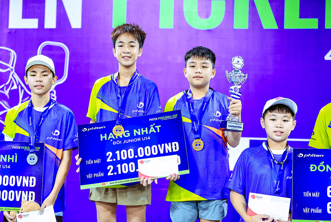 Buổi chiều cùng ngày tiếp tục bùng nổ với phần thi Junior U14, nơi các tay vợt trẻ thể hiện kỹ thuật điêu luyện và tinh thần thi đấu đầy máu lửa. Kết quả chung cuộc: Hiếu Minh – Dolar giành ngôi vô địch nhận giải thưởng 2,1 triệu đồng tiền thưởng và 2,1 triệu đồng vật phẩm, Đức Phát – Bảo Hân đạt giải Nhì, trong khi Lê Xuân Thái – Nguyễn Gia Bảo và Rafael Huỳnh – Nguyễn Hải Đăng đồng giải Ba.