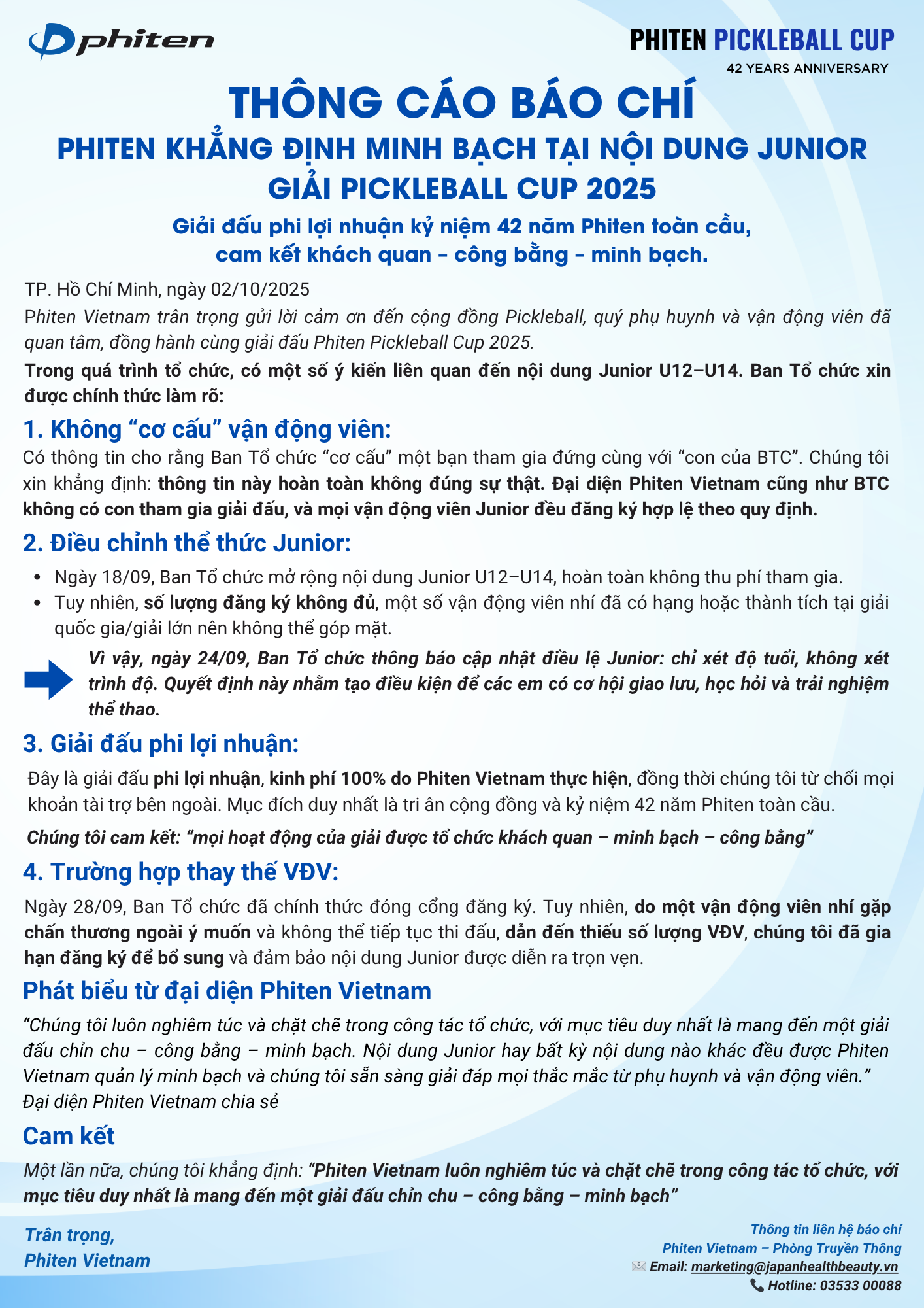 Phiten Vietnam khẳng định giải đấu Phiten Pickleball Cup 2025 được tổ chức với tinh thần phi lợi nhuận, minh bạch – công bằng – khách quan nhân dịp kỷ niệm 42 năm thành lập Phiten toàn cầu . Ban Tổ chức đã làm rõ các vấn đề và tiếp tục giữ vững cam kết vì cộng đồng thể thao.