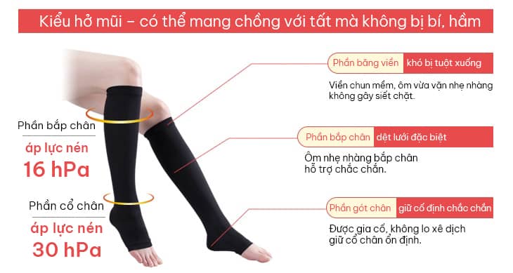 Áp lực nén được bố trí khoa học với lực nén cao ở cổ chân và giảm dần lên bắp chân, hỗ trợ lưu thông máu hiệu quả.