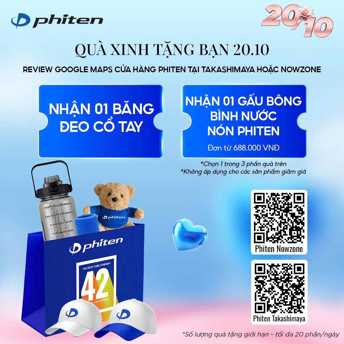 - Tặng 01 gấu bông/bình nước/nón Phiten với hóa đơn từ 688k + review google maps tại cửa hàng (áp dụng cho các sản phẩm không giảm giá).