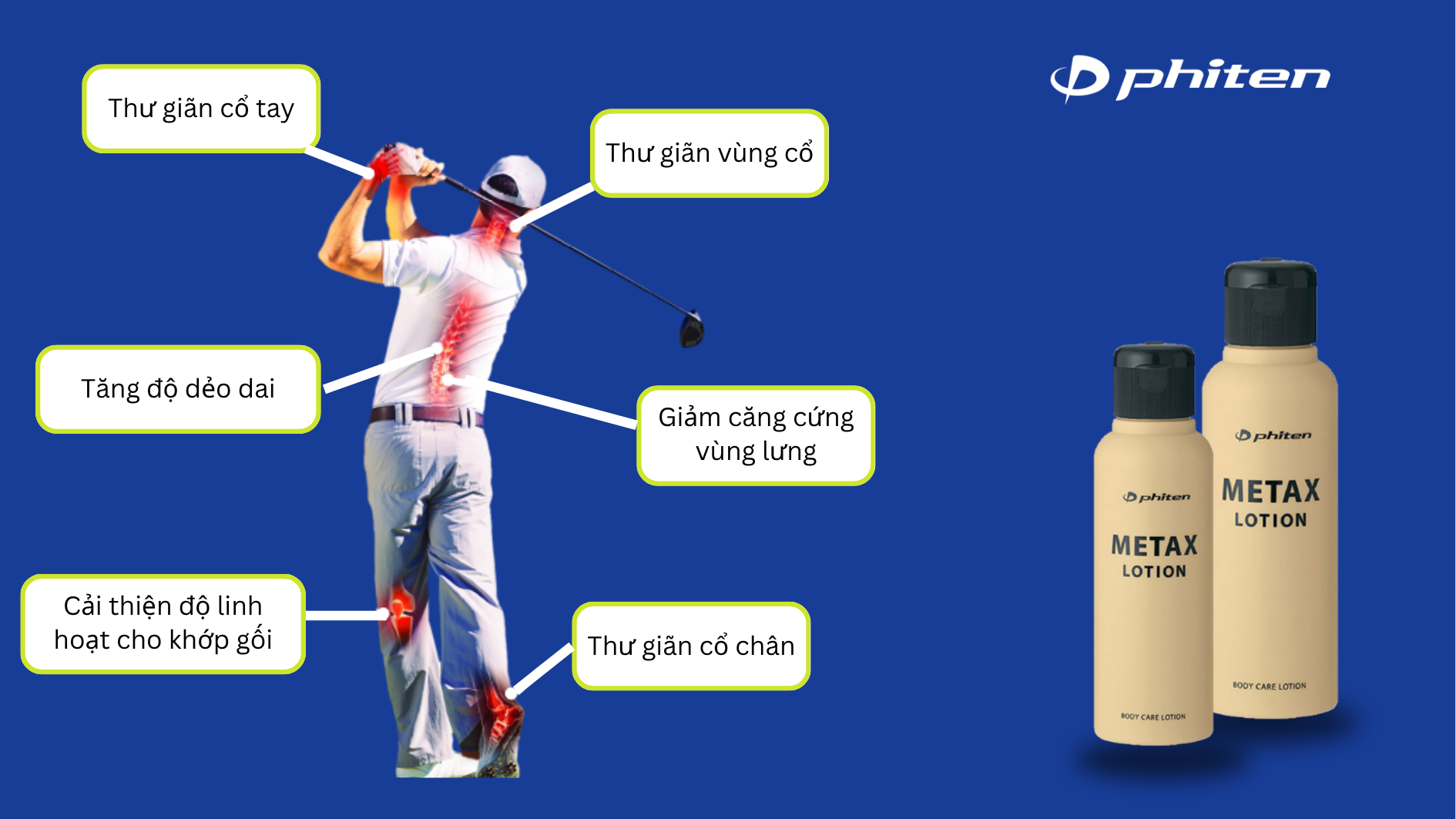 Sau khi khởi động, có thể thoa Metax Lotion lên vai, lưng, tay và các vùng cơ khác để làm dịu cơ thể, giúp giảm cảm giác căng cứng và tăng độ linh hoạt khi swing. Thói quen nhỏ này không chỉ giúp bạn giảm đau mỏi mà còn cải thiện đáng kể độ ổn định và chính xác trong từng cú đánh.