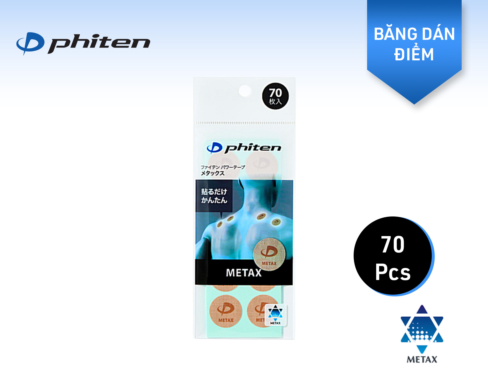 • PHITEN POWER TAPE METAX DISC là miếng dán hỗ trợ cơ bắp ứng dụng công nghệ METAX tiên tiến, giúp chăm sóc chuyên biệt các vùng cơ thể cần hỗ trợ và mang lại cảm giác thoải mái khi vận động và phục hồi
