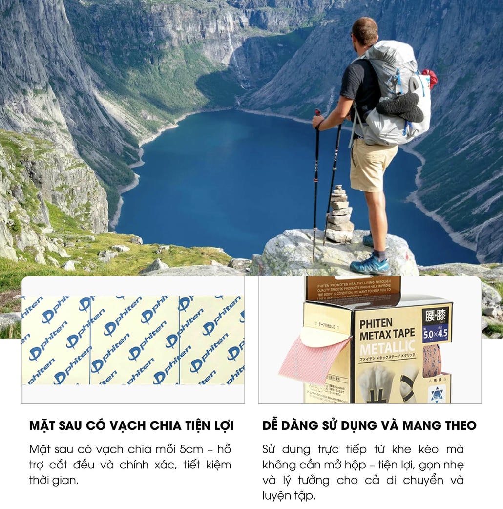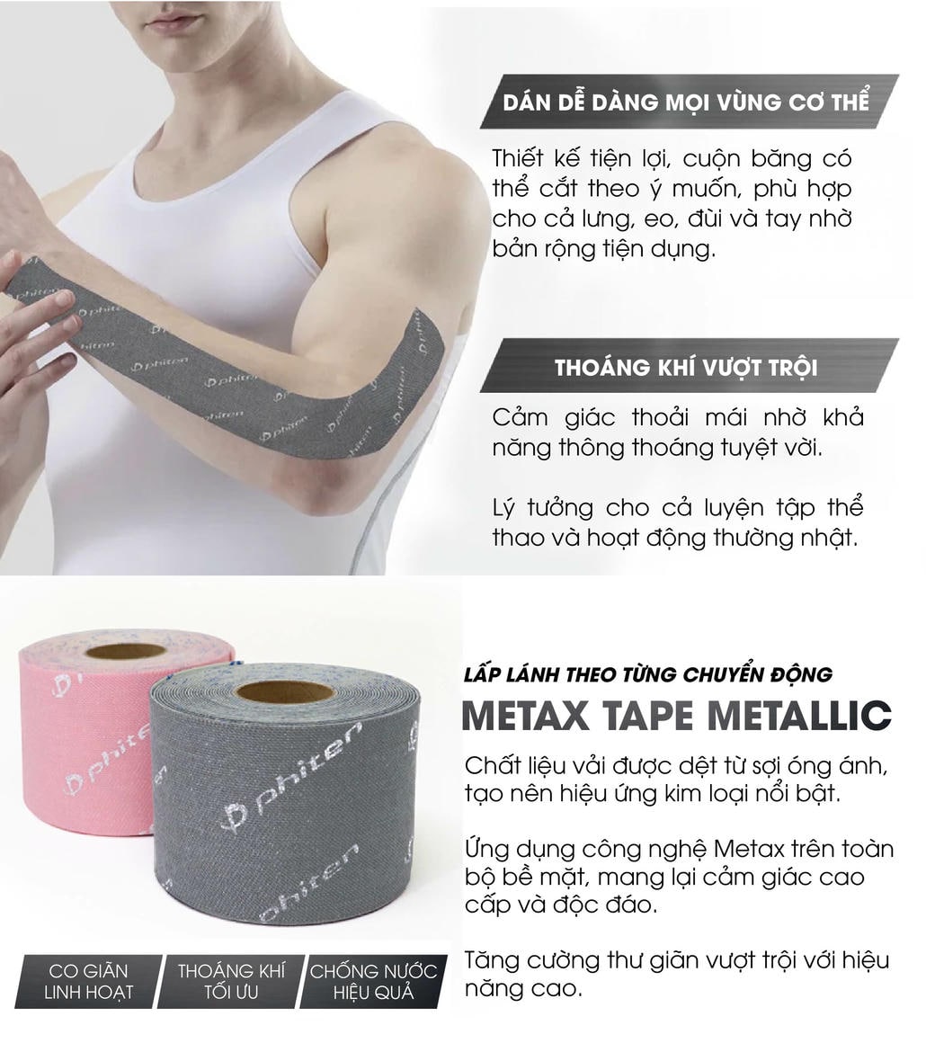 Là sản phẩm mới trong dòng Phiten Power Tape. Băng dán Phiten Metax Tape Stretched Metallic sử dụng Công nghệ Metax của Phiten. Vải dệt kim loại chống ẩm cải tiến, chống thấm mồ hôi, tắm rửa và tập luyện dưới nước, giúp bạn không phải lo lắng về độ bám và tập trung vào hiệu suất vận động.