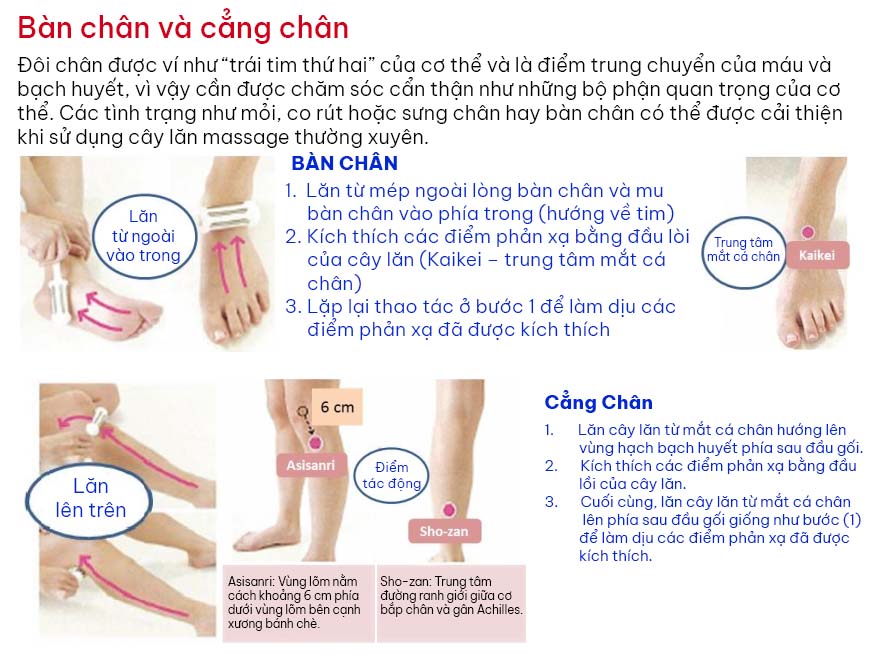 - Bước 2: Kích thích 2 điểm đau "asisanri" (dưới đầu gối 6cm theo góc nghiêng) & "sho-zan" (trên cổ chân) bằng nút dưới cây lăn