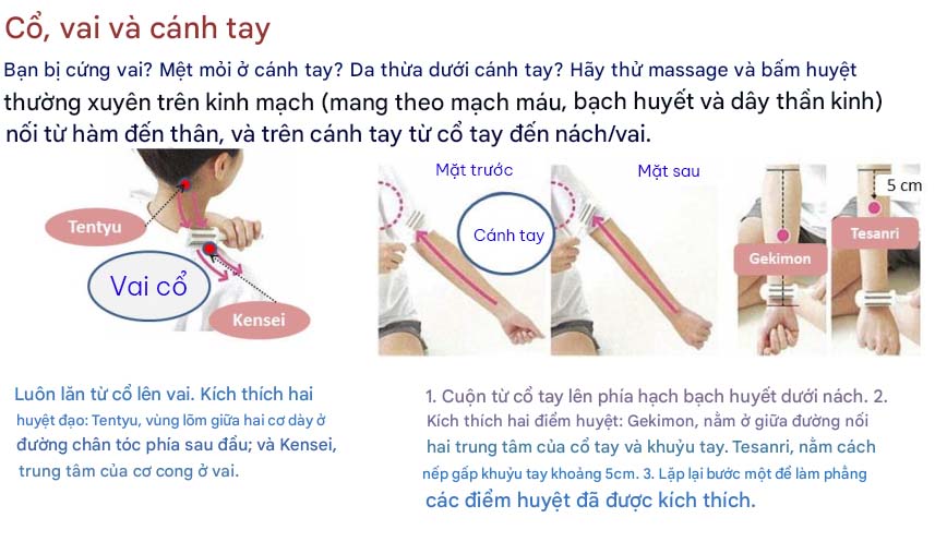 Cổ và vai: Đầu tiên lăn từ cổ xuống vai, sau đó ấn nhẹ vào 2 điểm đau "tentyu" và "kensei" như hình bên dưới (hình đầu)