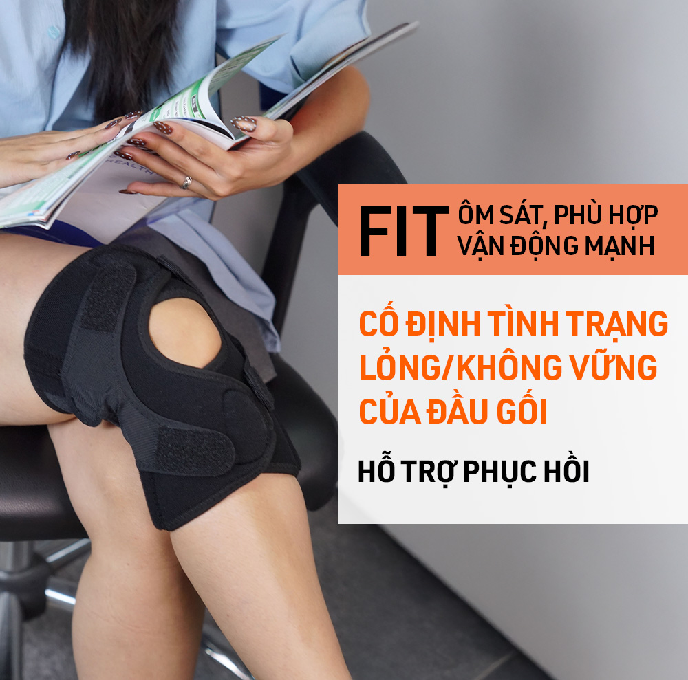 - Thanh đỡ linh hoạt hoạt động như nẹp, giúp hạn chế chuyển động ngang và tăng độ ổn định cho khớp gối.