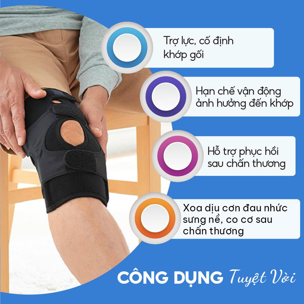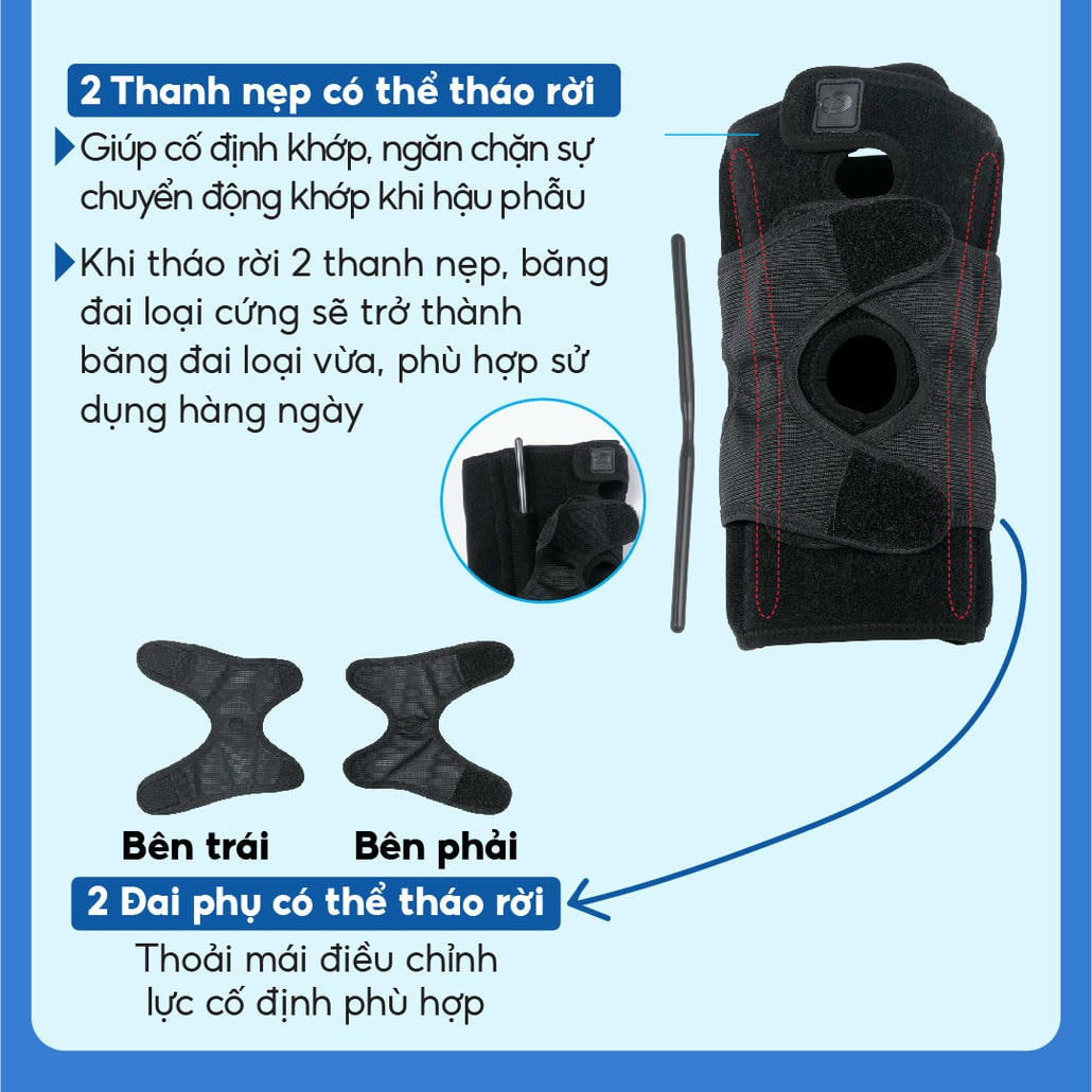 - Đai có thể tháo rời, hỗ trợ phục hồi viêm khớp, viêm gân, thấp khớp và các chấn thương khác liên quan đến đầu gối.