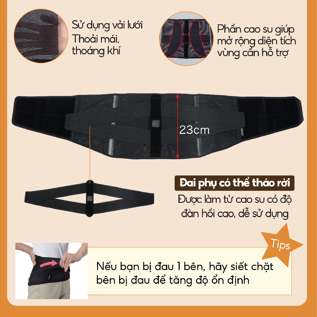 - Ổn định và hỗ trợ: Giúp ổn định vùng thắt lưng, giảm áp lực lên cột sống, hỗ trợ các khớp, cơ và gân xung quanh để bạn di chuyển thoải mái hơn.