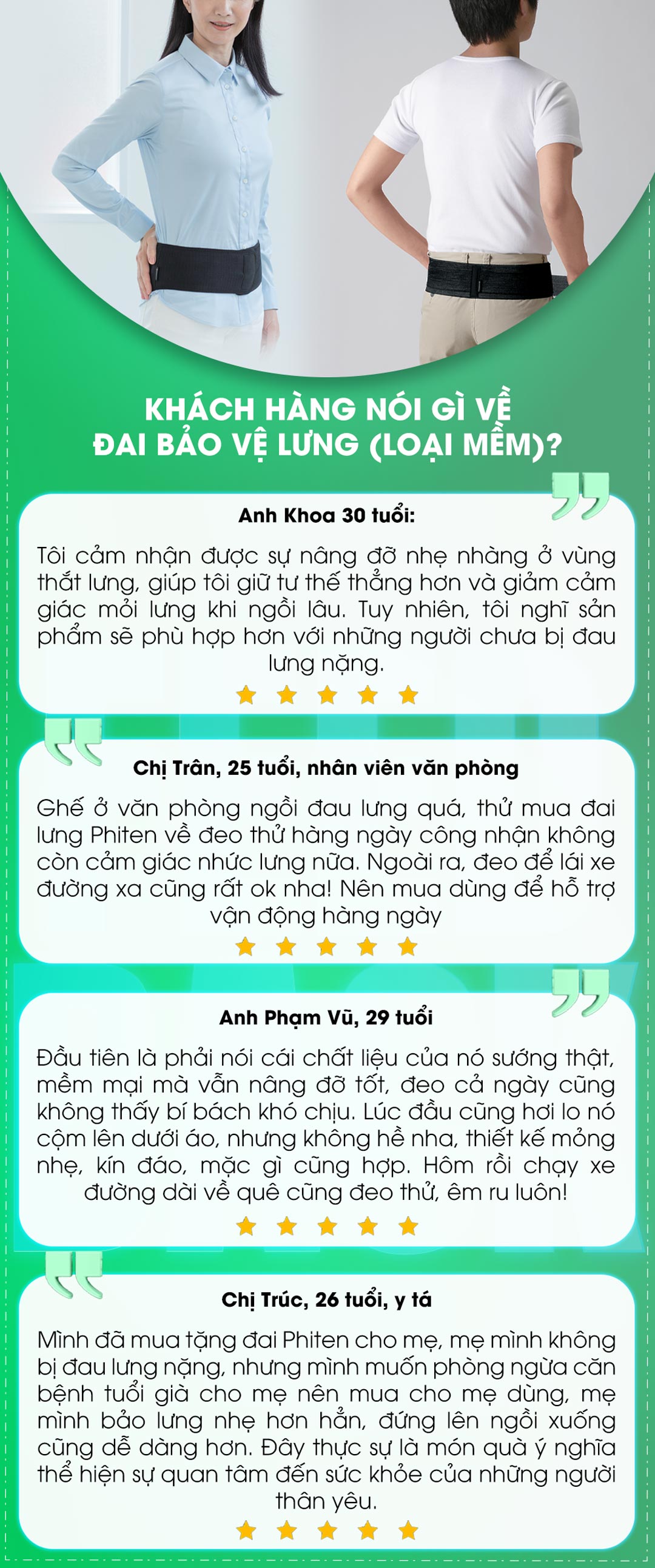 - Người phục hồi sau chấn thương: Đặc biệt hỗ trợ người đang phục hồi sau các chấn thương lưng, giúp hạn chế đau nhức và ổn định lưng một cách hiệu quả.