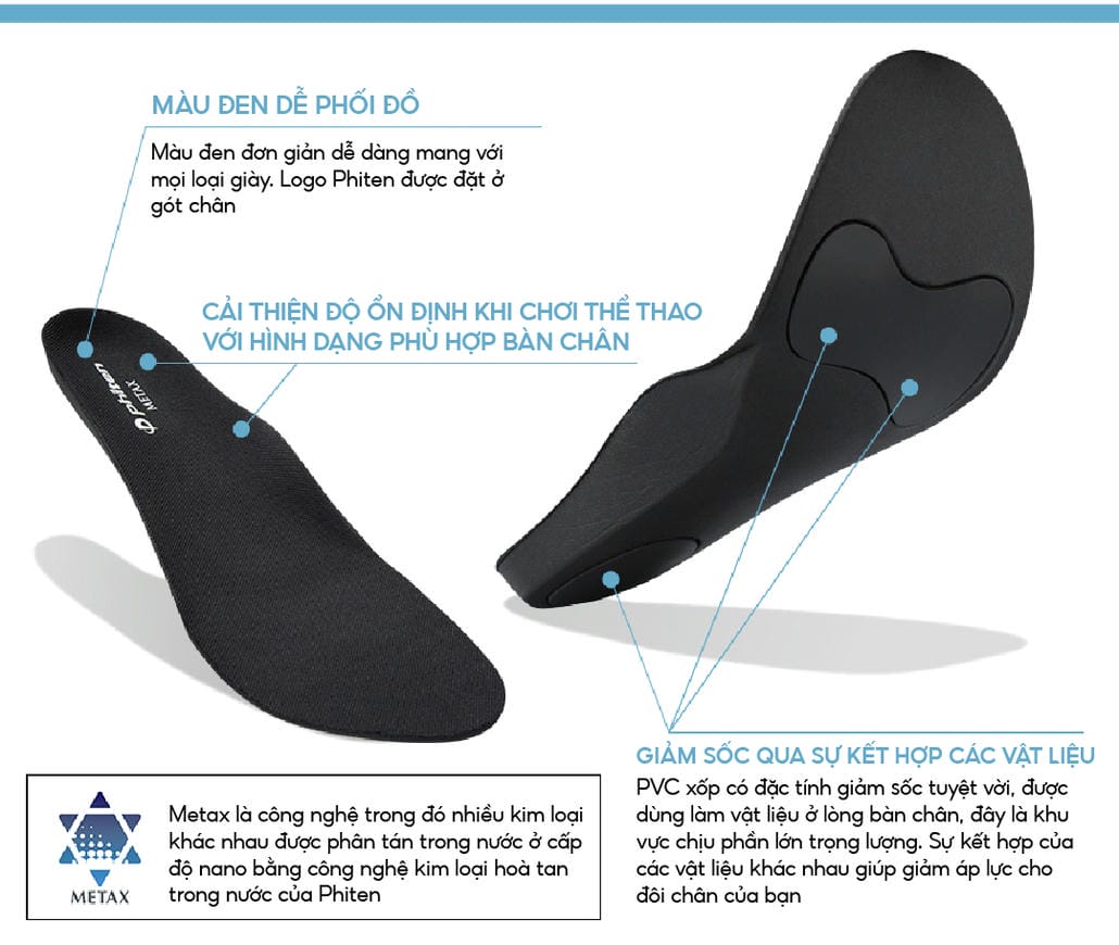 Lót Giày Phiten Metax_Cup Type với bộ giảm sóc kép cho các khu vực thường va chạm mạnh và tạo các đường viền cho bàn chân mang đến sự thoải mái vượt trội.