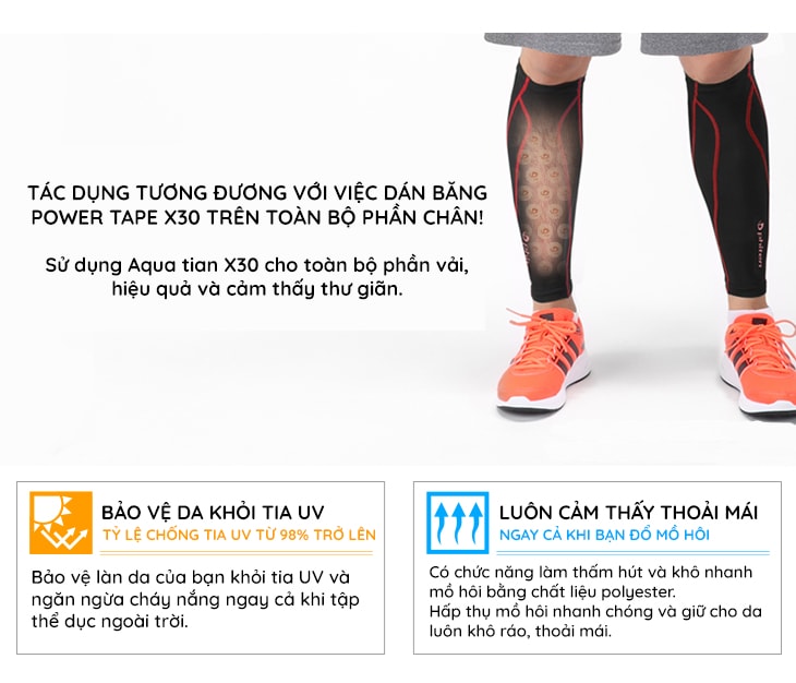 Bó ống chân thể thao (Sport Sleeves for Legs) sử dụng công nghệ Phiten AQUA TITANIUM X30 và công nghệ nén được thiết kế cho các khu vực ống quyển và bắp chân. Có độ bóp (nén) vừa phải, hỗ trợ để cải thiện hiệu suất của cơ chân khi vận động. Sợi vải nhanh khô sẽ giúp bạn cảm thấy khô và thoải mái và các viền phẳng giúp giảm xơ xước. Đặc tính sản phẩm: Vải nhanh khô, hấp thụ mồ hôi và nhanh khô. Sức nén (bóp) vừa phải giúp hỗ trợ cơ tay. Cải thiện độ phát quang khi sử dụng buổi tội, nhờ logo dạ quang. Viền nối phẳng giúp da cảm thấy thoải mái và dễ chịu.Giảm đến 98% hoặc hơn tia UV Công nghệ và chất liệu: AQUA TITANIUM X30/ Polyester 85% và Polyurethane 15% (LYCRA®) Sản xuất tại Việt Nam