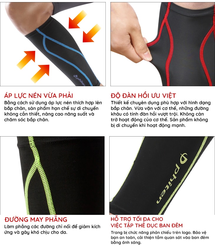 Sử dụng công nghệ Phiten Aqua-Titanium với nồng độ 30 lần. Bó ống chân có khả năng chống tia cực tím 98% Thiết kế nhiều màu sắc, dễ phù hợp với nhu cầu Chất liệu giúp hấp thụ mồ hôi nhanh chóng và giữ cho da khô và thoải mái Nén nhẹ trên bắp chân và cơ khuỷu chân khi mang vật nặng, chơi vợt, chơi golf Giảm cảm giác mỏi bắp chân và khuỷu chân, cảm nhận sự nhẹ nhàng Giảm axit lactic Thư giãn tức thì, cải thiện cân bằng cơ thể